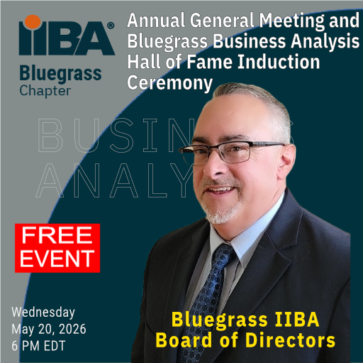 The Bluegrass IIBA Chapter will host its Annual General Meeting (AGM) and induct the eleventh class of professionals into the Bluegrass Business Analysis Hall of Fame (BBAHoF). The AGM will look at what the Chapter has accomplished in the past year in relation to its strategic plan, its community outreach efforts, relationships it has built and inform participants of the strategic plan for the coming year. There are transformational changes happening in the global business analysis community, we will look at how the Bluegrass IIBA Chapter will bring those changes to the Bluegrass business analysis community.
