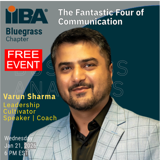 The Bluegrass IIBA Chapter is thrilled to invite you to an exclusive session with communication expert Varun Sharma. He will reveal the four essential pillars of a transformative approach to connecting, building trust, and engaging your audience—separating ordinary communicators from truly exceptional ones.